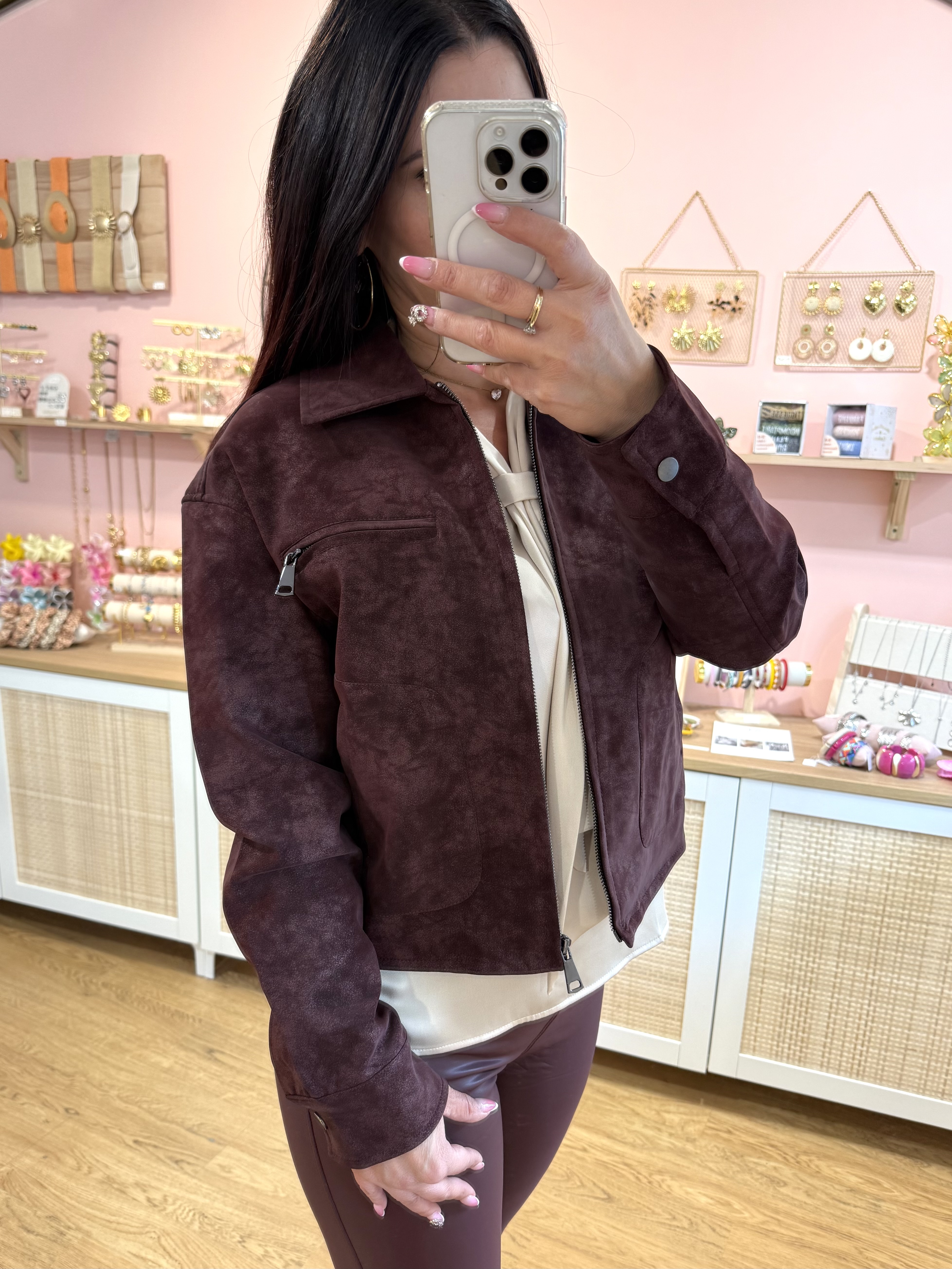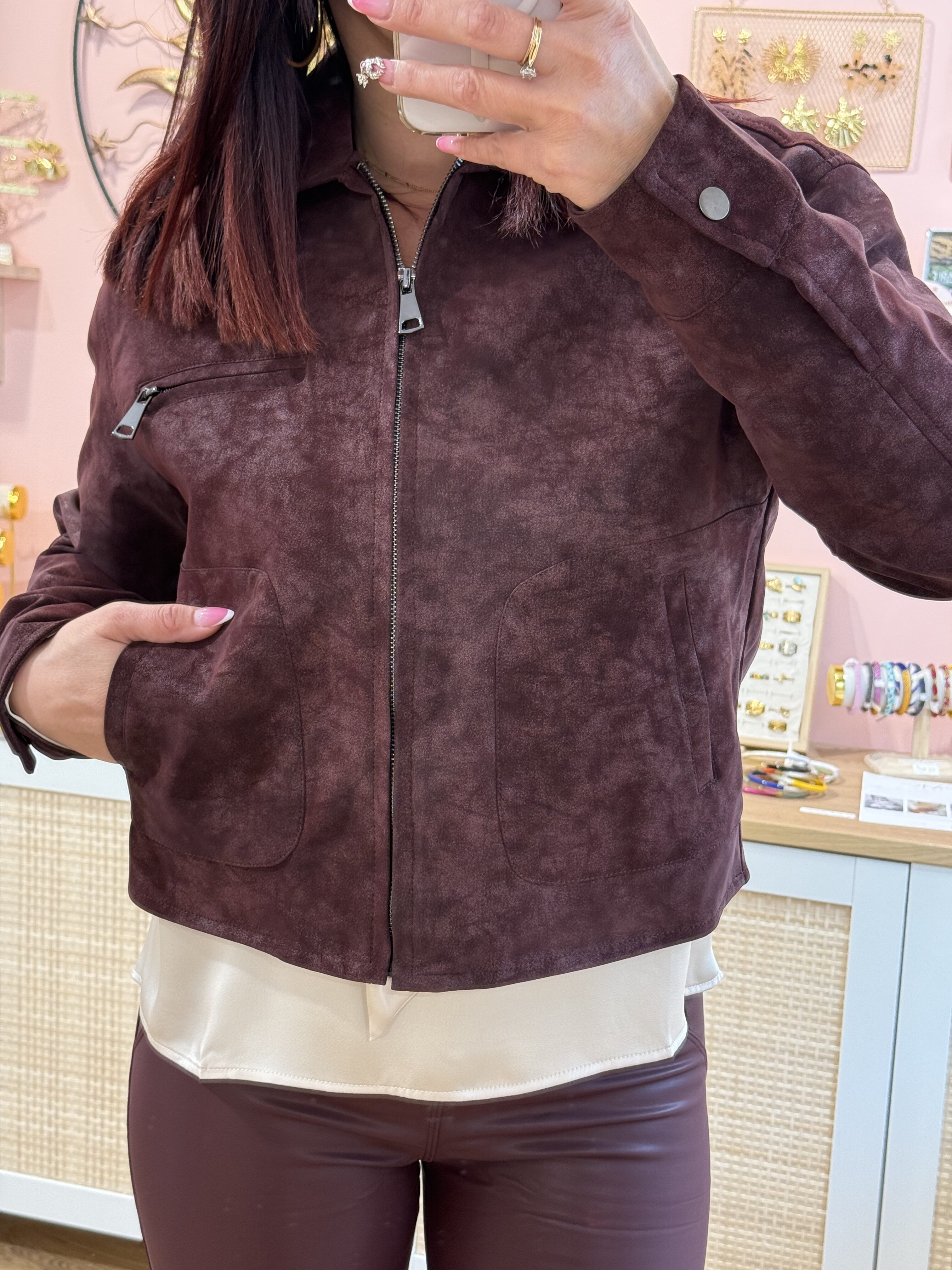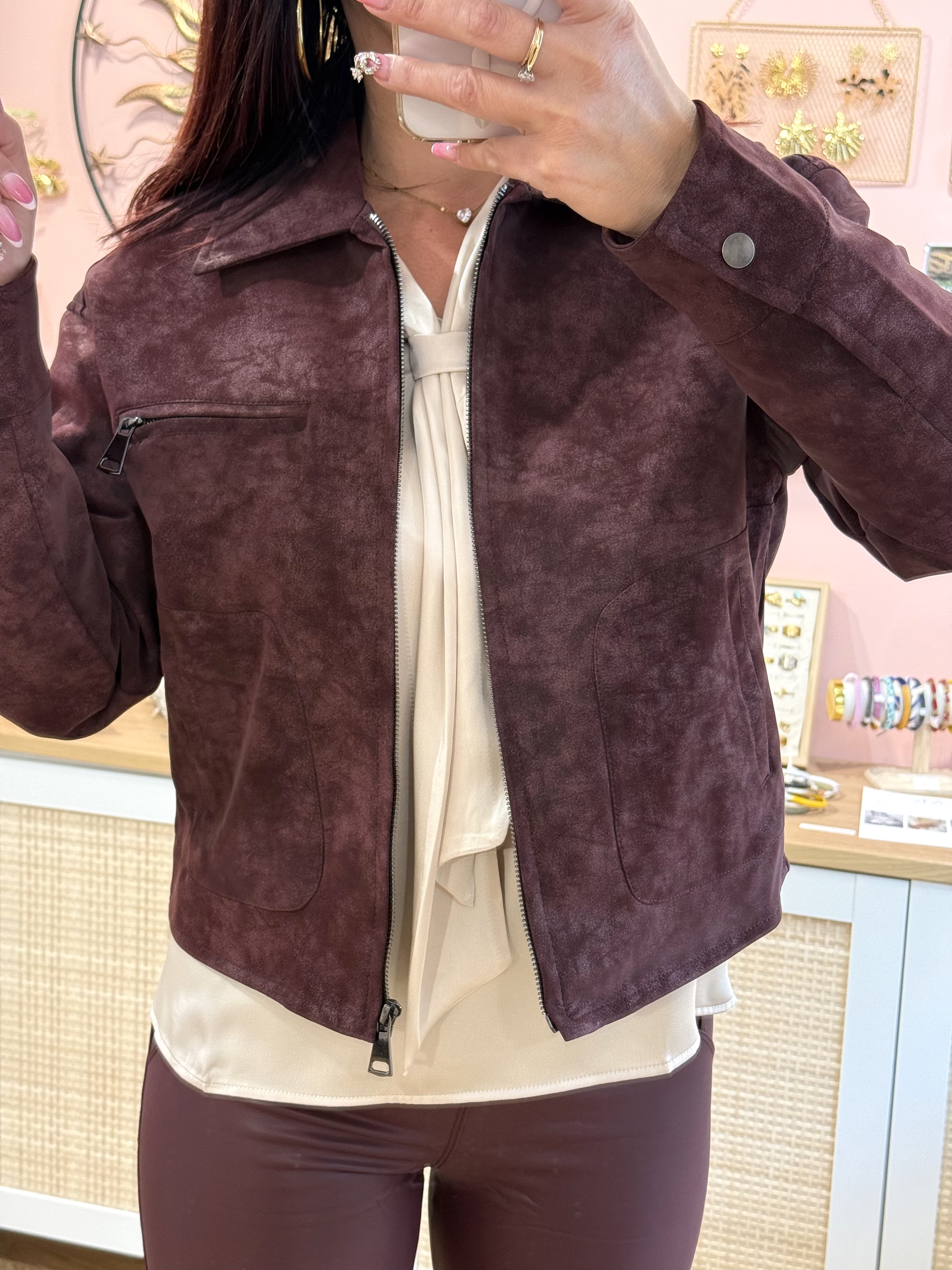 La veste Maelis est la pièce idéale pour allier confort et élégance en toute saison. Confectionnée dans une matière effet suédine toute douce, elle séduit par son toucher velouté et son aspect raffiné.