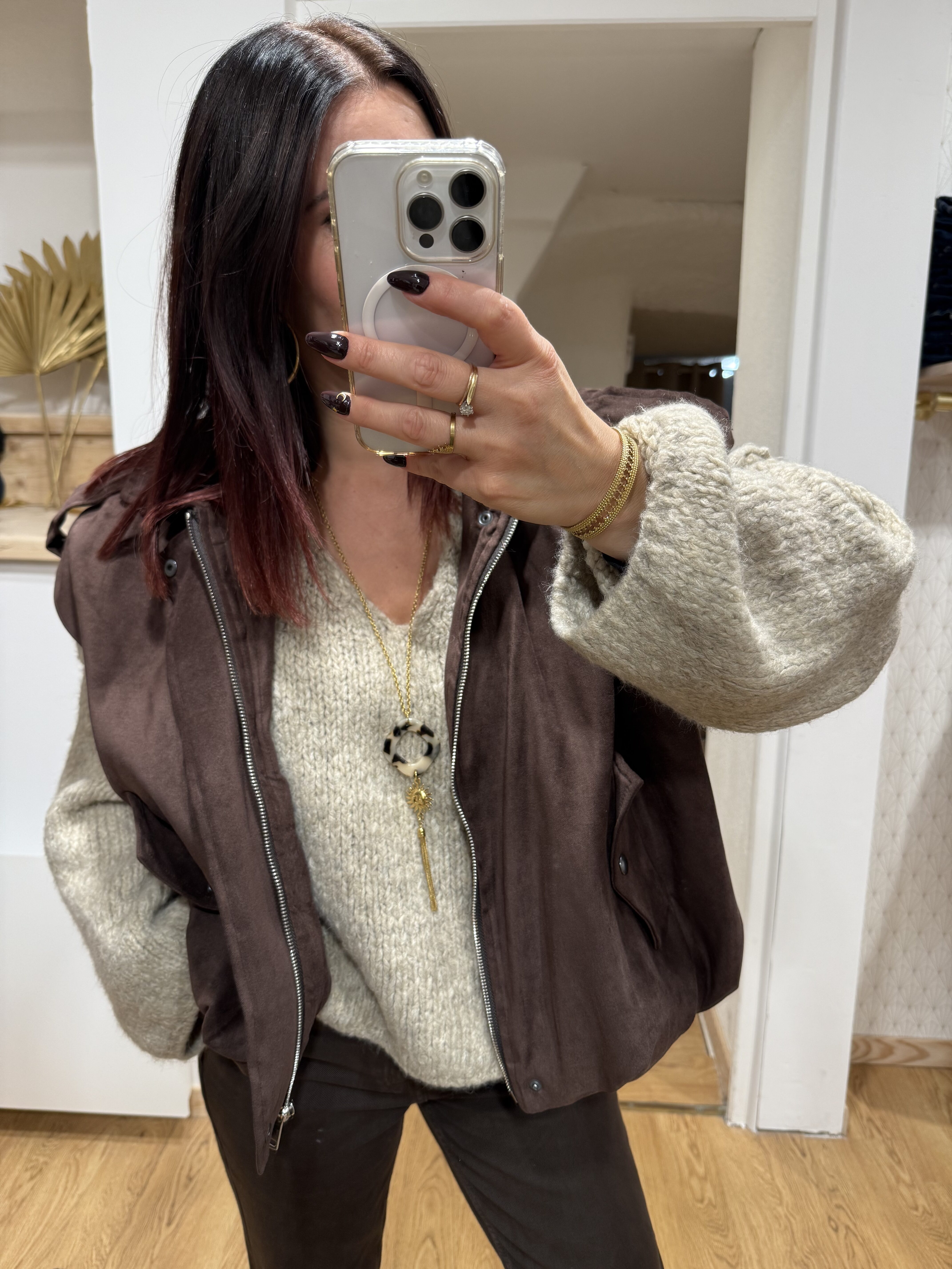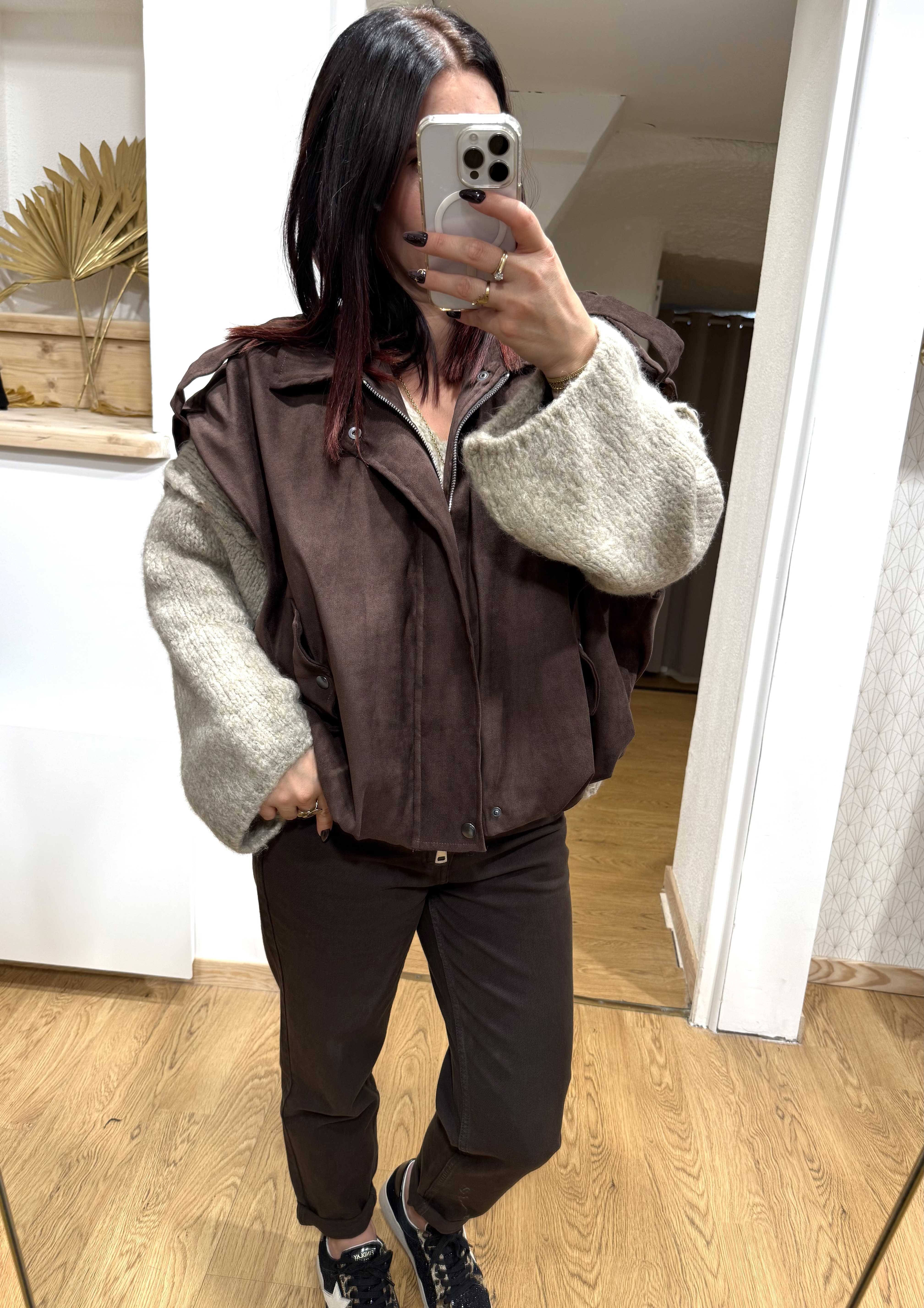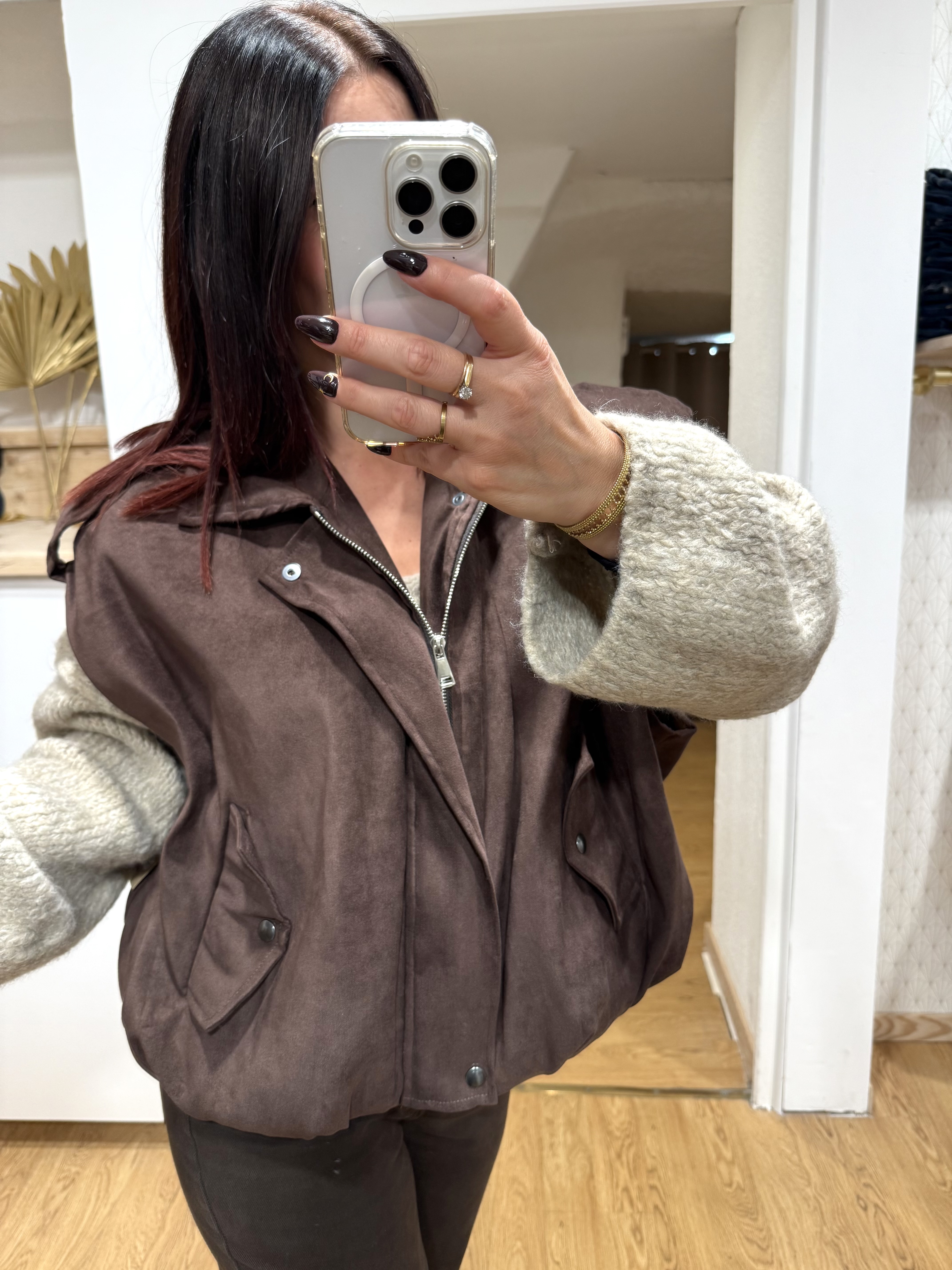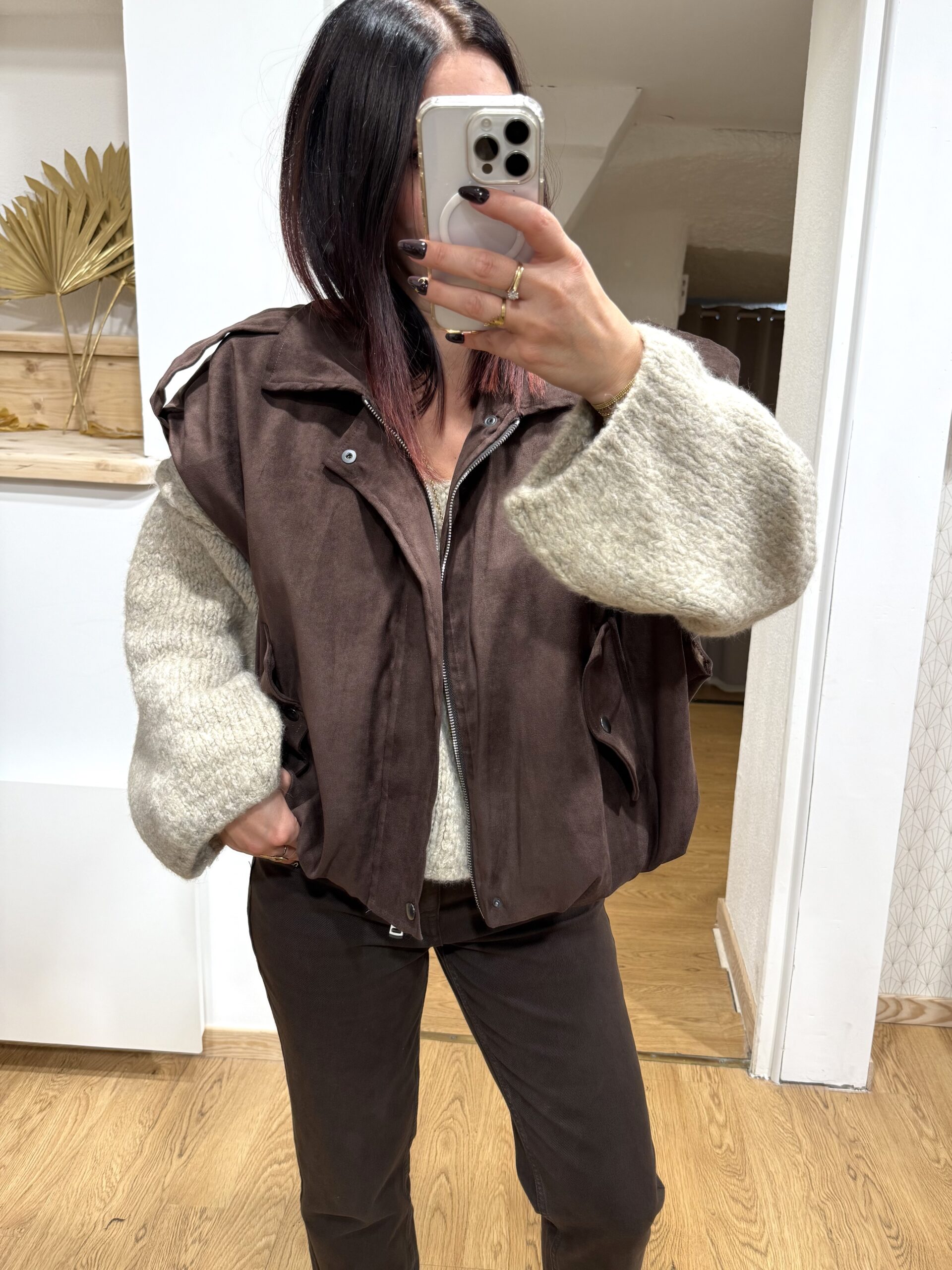 La veste Marlone séduit par son style affirmé et sa matière douce effet suédine. Son coloris chocolat intense, ultra-tendance cet automne, s’accorde avec toutes les teintes de saison : beige, écru, camel ou noir.