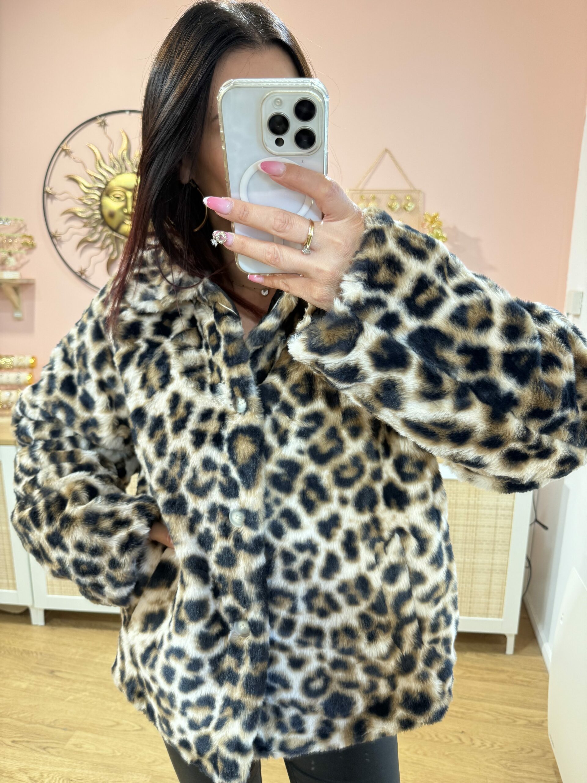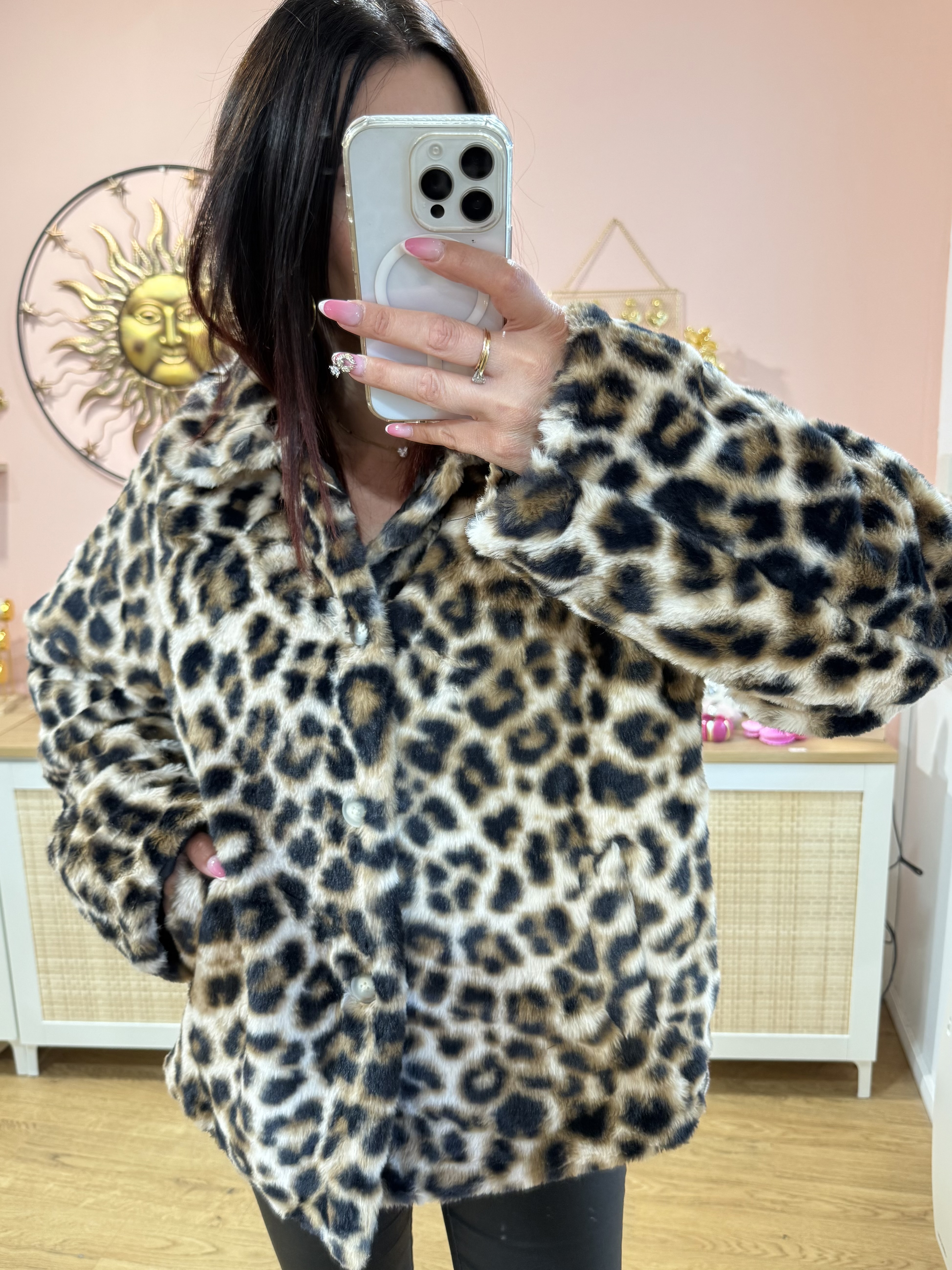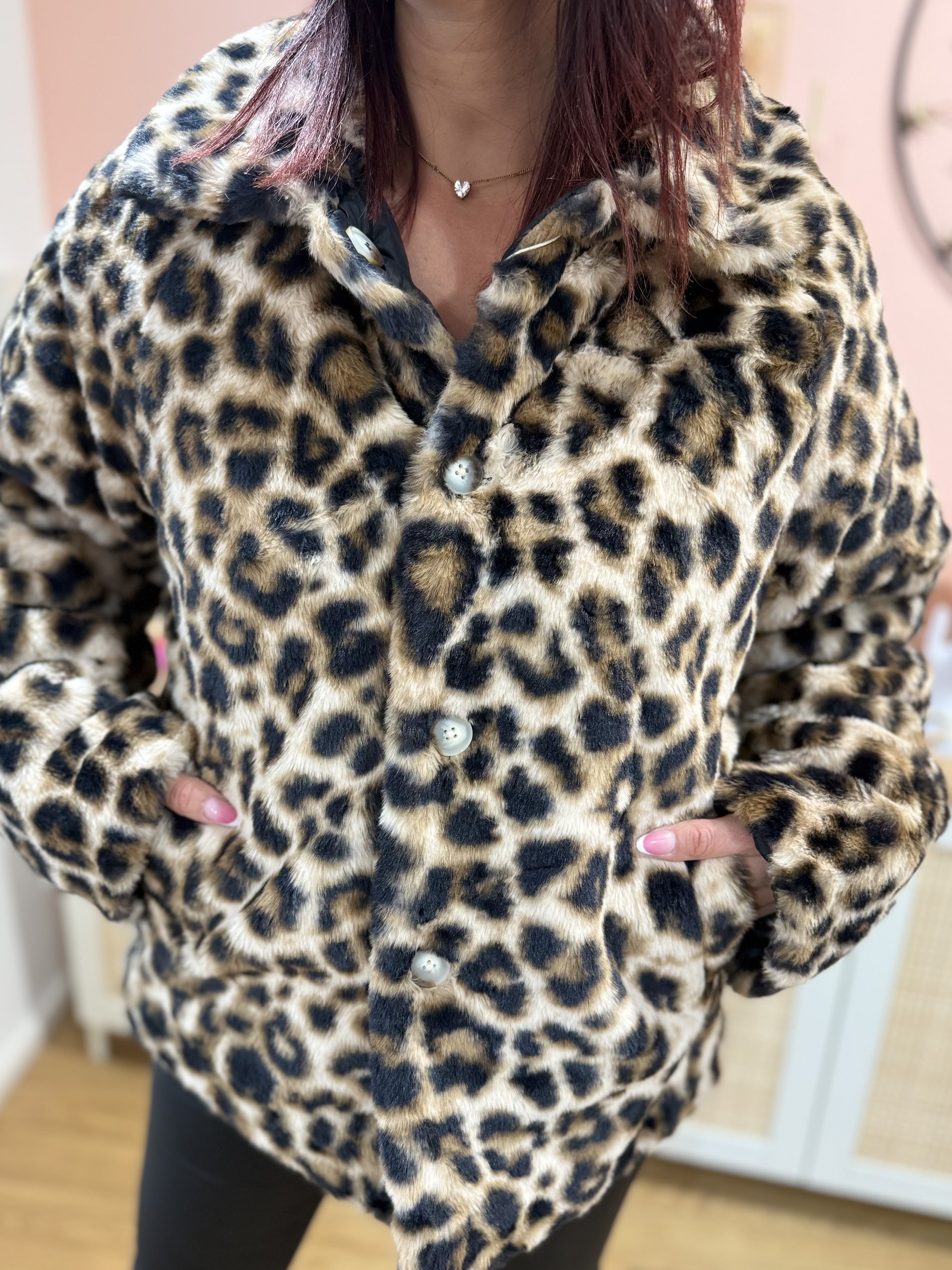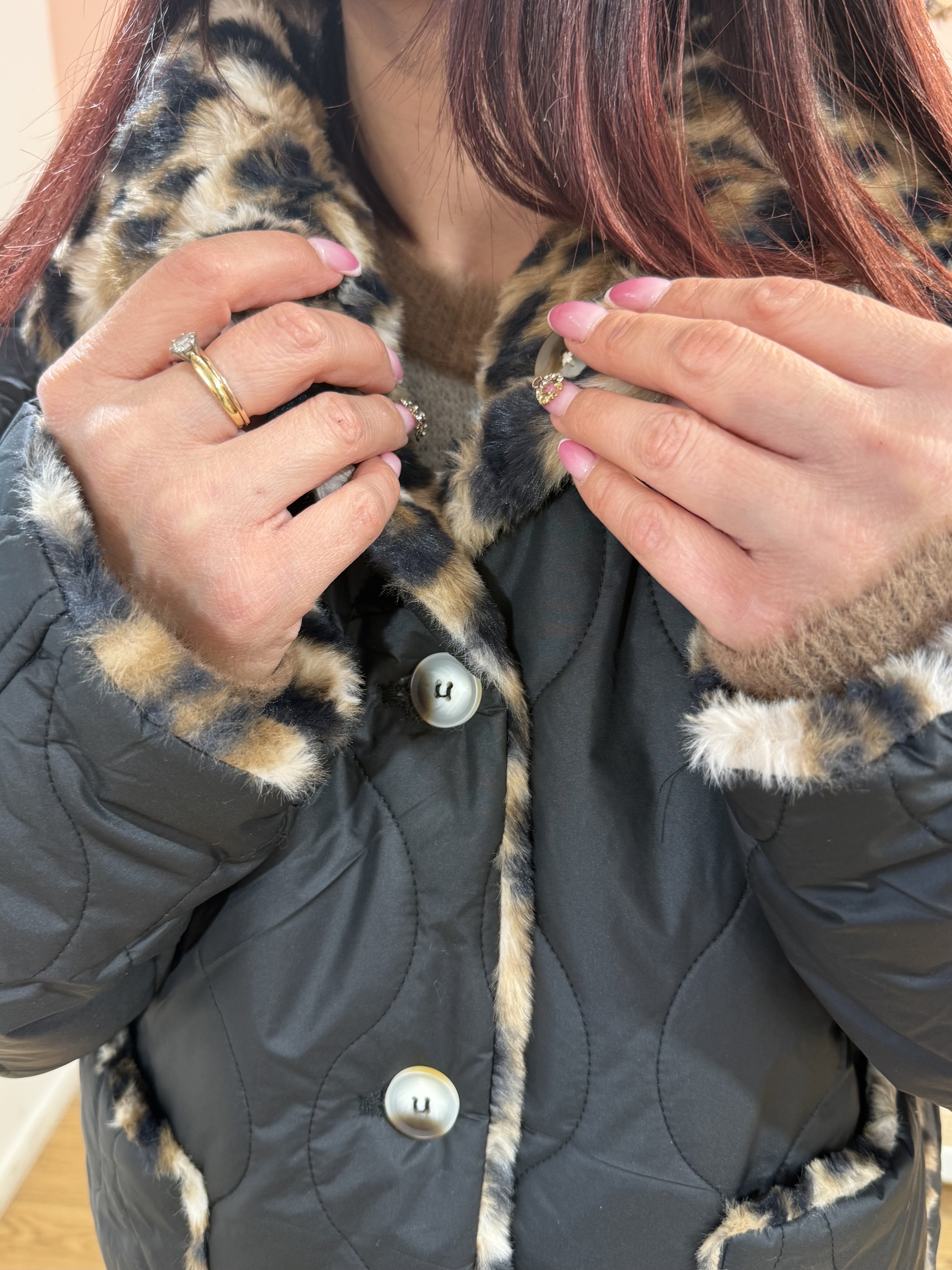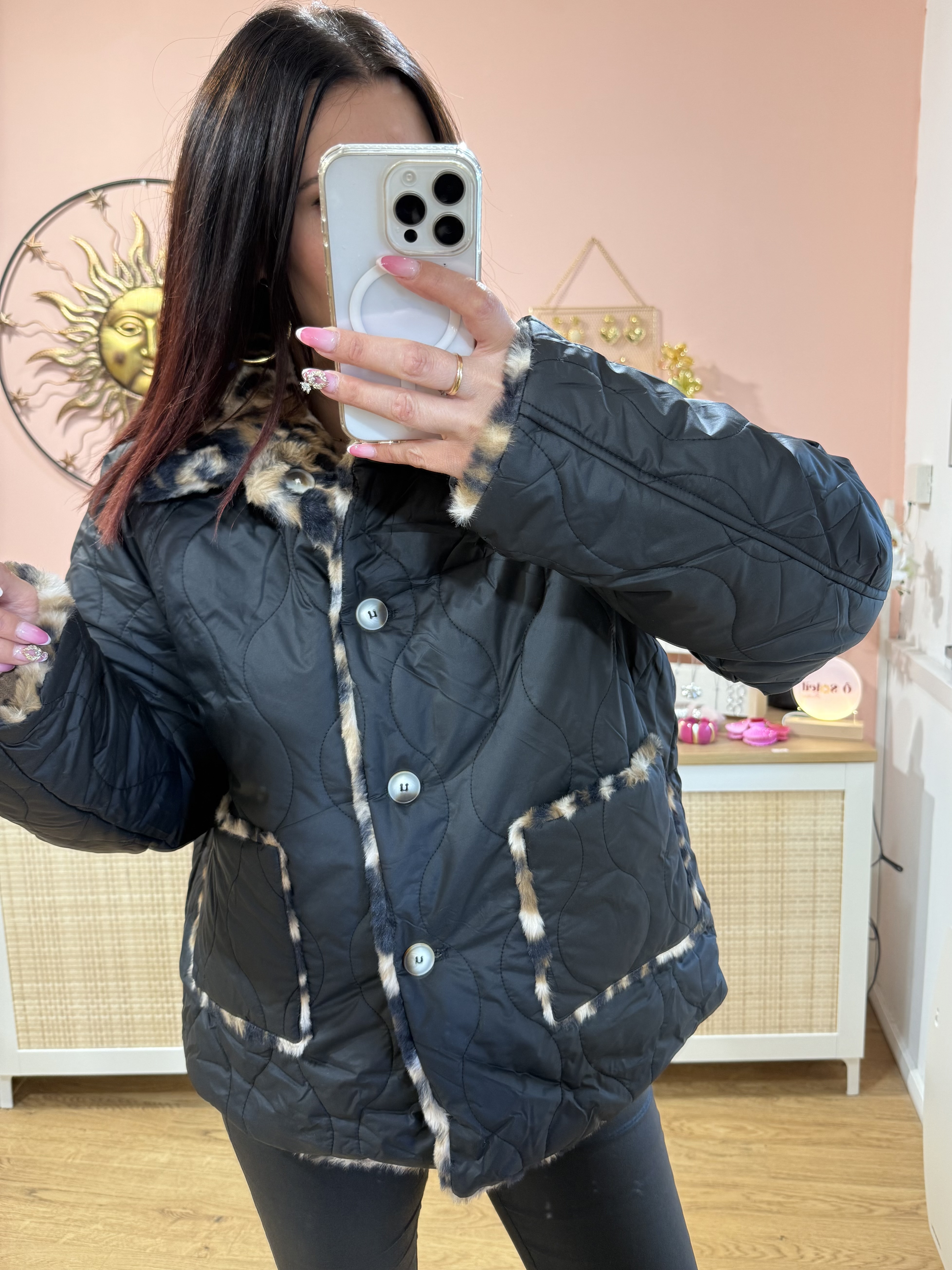 Veste réversible Liora – Effet fausse fourrure léopard & matelassé noir